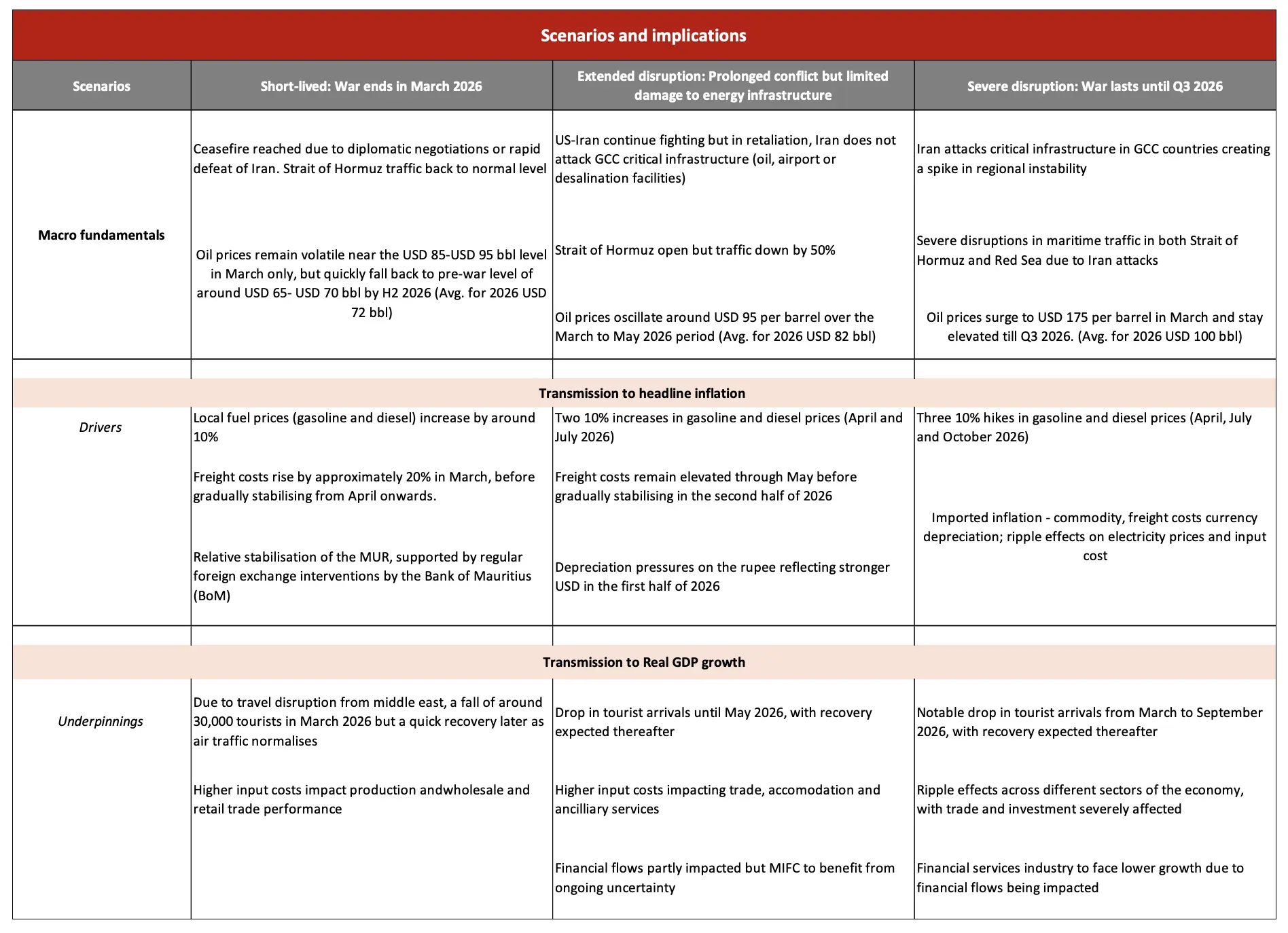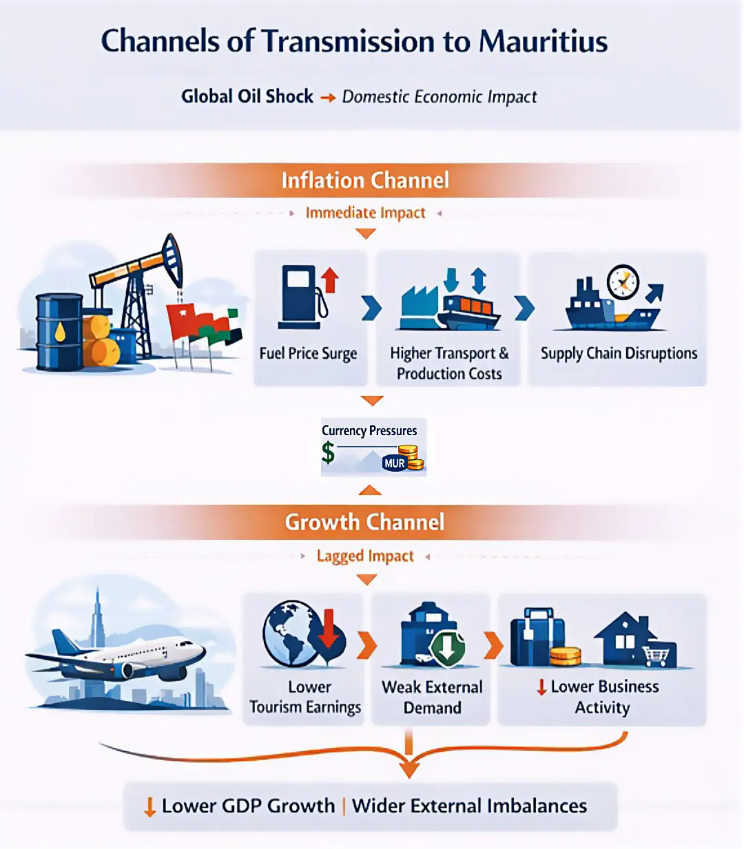 For small, open and import‑dependent economies such as Mauritius, these dynamics constitute a significant external shock, transmitted through our regional exposure and amplified by rising import costs and weakening global demand. At this stage, the shock is best characterised as cost‑push and stagflationary in nature with inflationary pressures rising while the growth momentum softens. The scale of the impact will depend critically on the severity and duration of the conflict.