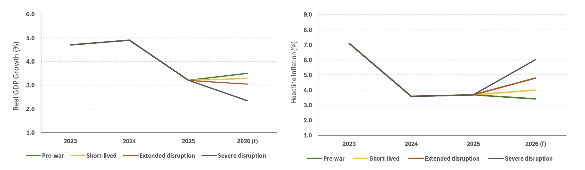 Given the high degree of uncertainty, a scenario‑based approach provides a more informative framework than point forecasts at this stage. The implications are set out in the table below and illustrative macroeconomic outcomes are shown in the charts that follow.