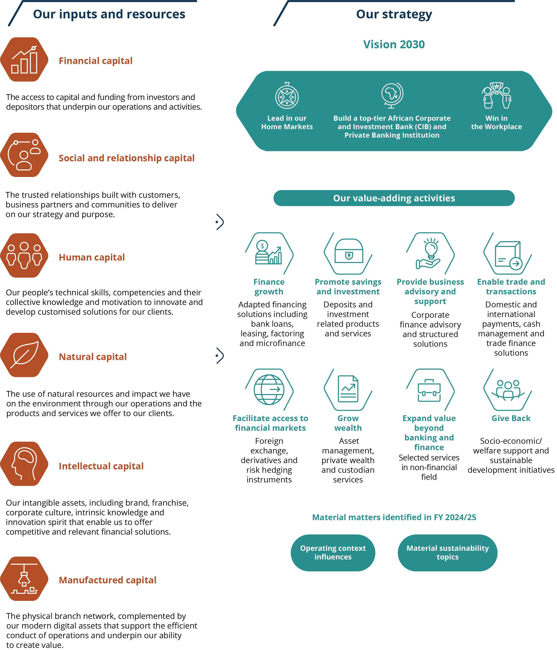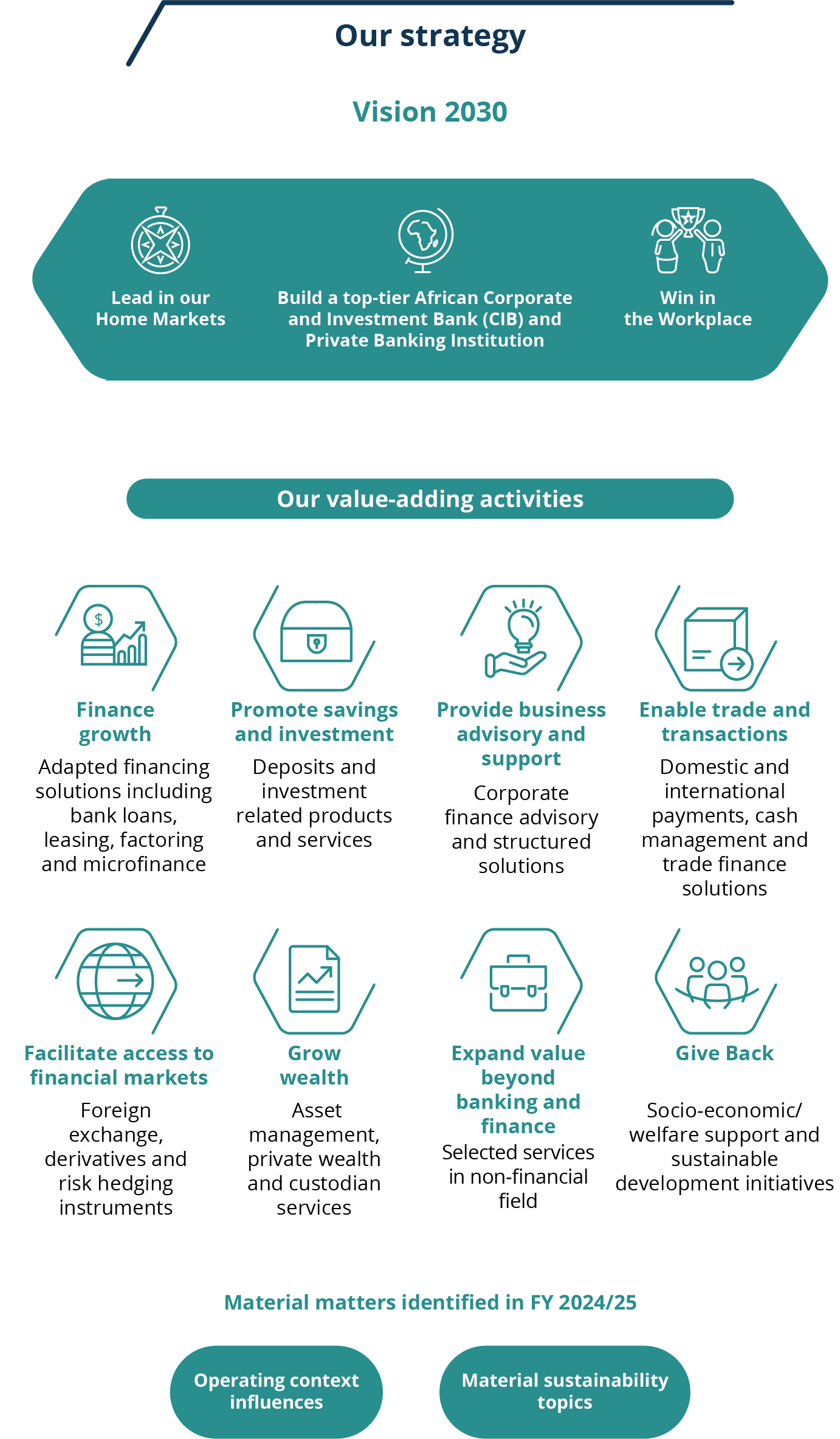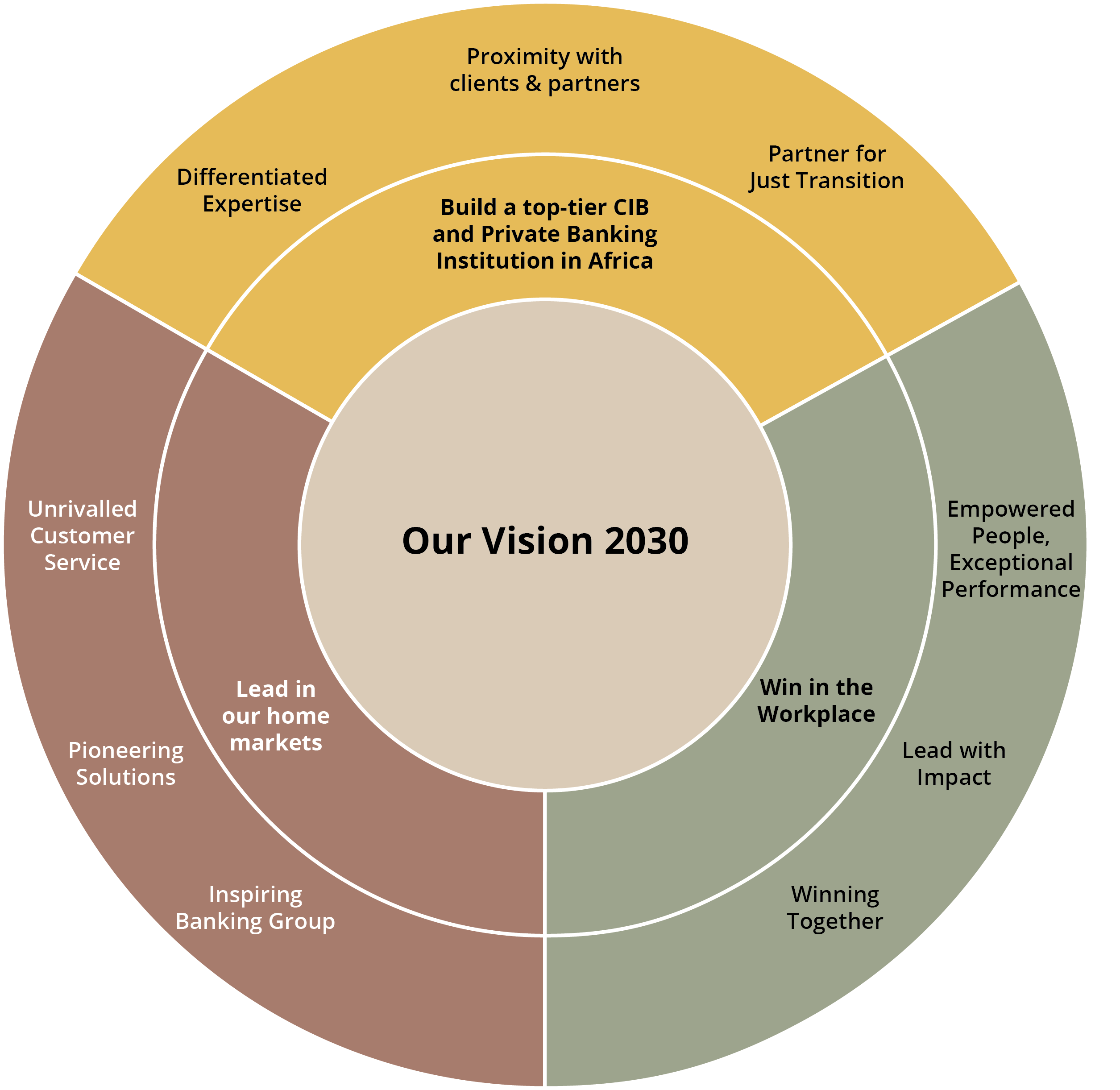 Guided by the ambition outlined in Vision 2030, we have defined our strategic priorities to shape our direction and actions over the next five years in a fast-changing world. These priorities are articulated around three pillars (i) leading in our home markets, namely Mauritius, Madagascar, Seychelles and Maldives by driving innovation, uplifting customer experience and supporting inclusive economic development; (ii) establishing ourselves as a top-tier Corporate and Investment Bank and Private Banking institution in Africa, contributing to the continent’s socio-economic progress through trade, investment and support for a just transition; and (iii) creating a winning workplace that empowers people and fosters innovation. In doing so, we seek to create lasting value for our stakeholders and contribute to a sustainable and inclusive future.